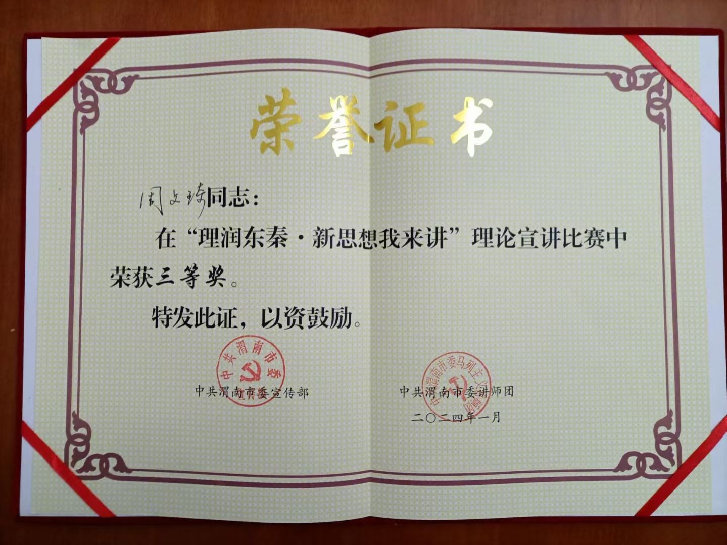 1月25日下午,由市委宣传部主办,市委讲师团、“学习强国”渭南学习平台、市东雷二期抽黄工程管理中心承办的“理润东秦·新思想我来讲”理论宣讲比赛在我市举行。公司周文琦同志参赛,并荣获三等奖。
