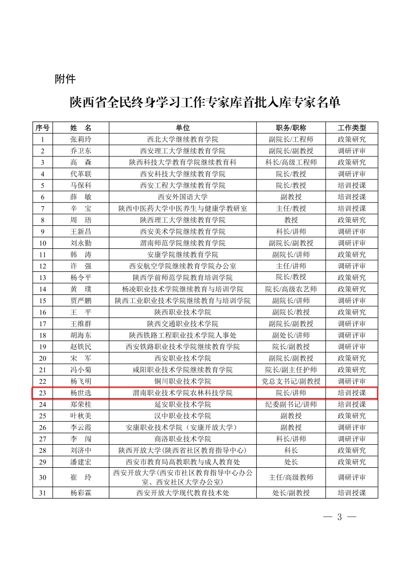 根据《陕西省教育厅办公室关于公布陕西省全民终身学习工作专家库首批入库专家名单的通知》(陕教职办〔2022〕21 号),公司农林科技公司经理杨世选成功入选全民终身学习工作专家库首批入库专家。
