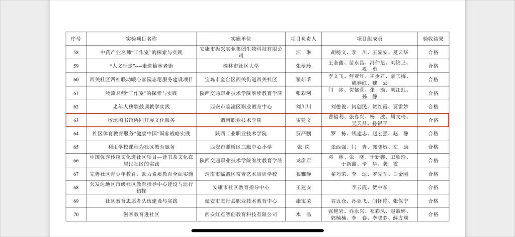 近日,陕西省教育厅办公室印发《陕西省教育厅办公室关于公布陕西省第三批社区教育实验项目结项验收结果的通知》(陕教职办〔2022〕28号),公司申报的社区教育实验项目《校地图书馆协同开展文化服务》顺利通过结题验收,验收结果为“合格”。
