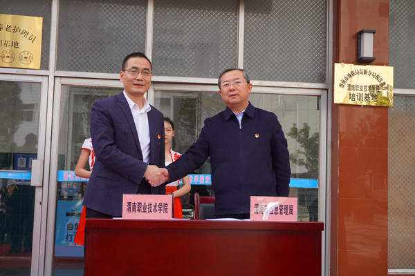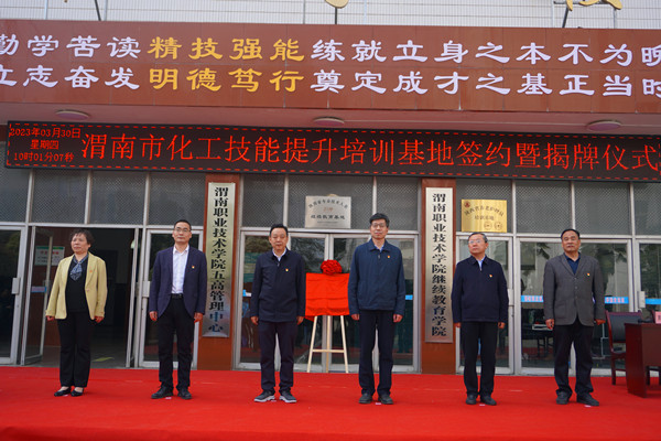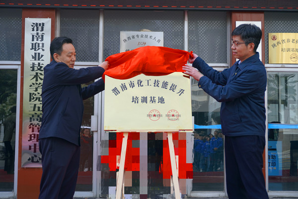 陈峰和靳华锋共同为“渭南市化工技能提升培训基地”揭牌。张百侣和王韦华签订基地战略合作协议。与会人员参观了培训教室、餐厅和培训公寓,对公司良好的办学条件给予充分肯定。