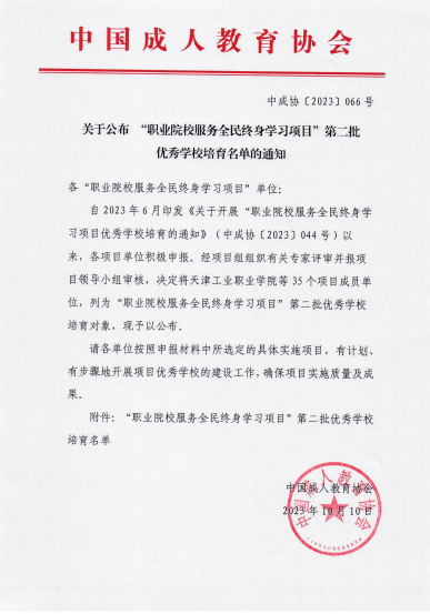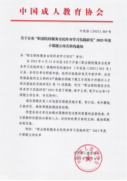 中国成人教育协会确定公司为“职业院校服务全民终身学习项目”第二批实验校。公司成功入选“第二批职业院校服务全民终身学习项目”优秀公司培育名单。
