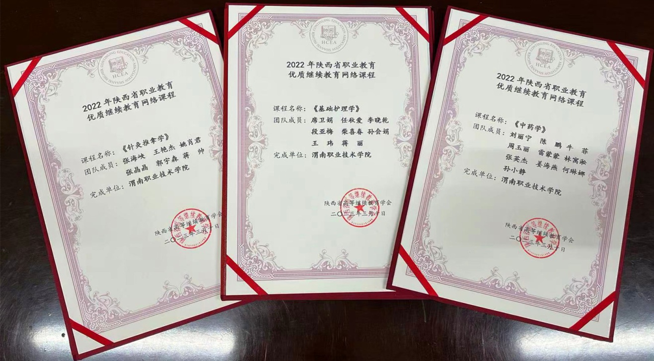《针灸推拿学》《基础护理学》《中药学》3门课程被认定为陕西省职业教育优质继续教育网络课程。